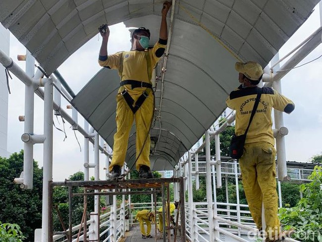 Perbaikan Jembatan Penyebrangan Orang (JPO) Dukuh Atas 1, RT10/RW11 Jl Sudirman, Kuningan, Setiabudi, Jakarta Selatan, dimulai hari ini. Atap jembatan yang bolong bakal diganti.