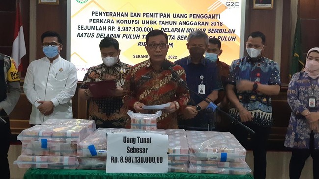 "Rp 8,9 miliar ini merupakan uang titipan, uang pengganti sebagaimana hasil penghitungan kerugian," kata Kajati Banten Leonard Eben Ezer Simanjuntak kepada wartawan, Jumat (1/4/2022).