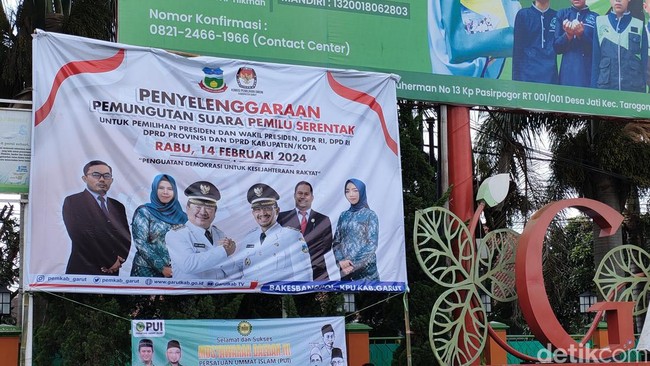 Pemerintah Kabupaten Garut, Jawa Barat, memasang baliho sosialisasi Pemilu 2024. Baliho berukuran besar itu dipasang di sejumlah titik di Garut.