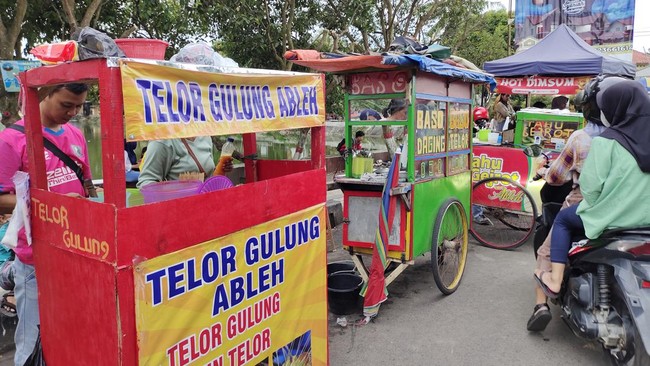 Berdasarkan pantauan detikcom di lokasi, Minggu (3/4/2022), puluhan pedagang itu tumpah di bahu jalan. Mereka berjualan makanan, minuman, hingga mainan. Warga yang berburu pun cukup membuat kemacetan di sekitar lokasi.