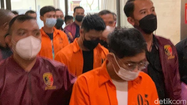Pantauan detikcom di Bareskrim Polri, Kamis (7/4/2022), tampak Fakarich dan Brian Edgar menggunakan baju tahanan berwarna oranye. Keduanya tampak menggunakan masker.