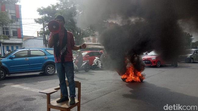 Selanjutnya, massa aksi juga membakar sejumlah ban bekas hingga api berkobar di badan jalan. Petisi penolakan penundaan Pemilu 2024 juga dibentangkan mahasiswa di badan jalan.