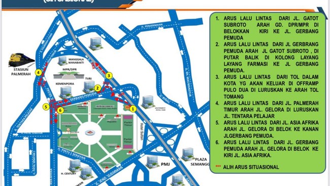 1. Arus lalu lintas dari jalan Gatot Subroto arah gedung DPR/MPR dibelokkan kiri ke jalan Gerbang Pemuda.