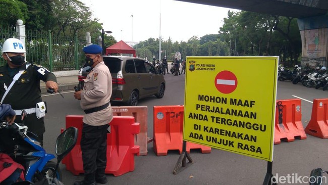 Salah satu petugas mengatakan jalan sudah ditutup sejak 30 menit yang lalu. Jalan ditutup untuk mengantisipasi adanya demo.