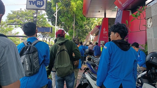 Pantauan detikcom pukul 12.05 WIB di sekitar Jalan Gerbang Pemuda, Senayan, Tanah Abang, Jakarta Pusat, para mahasiswa yang memakai almamater berwarna biru berkumpul di pedestrian Jalan Gerbang Pemuda. Mereka datang dengan menggunakan angkot.