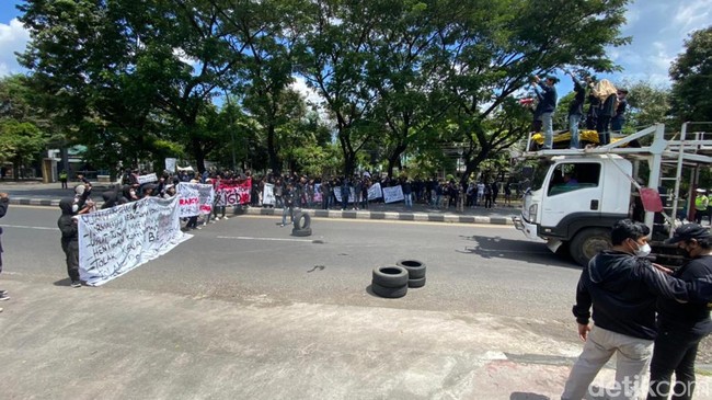 Mahasiswa Universitas Islam Negeri (UIN) Alauddin Makassar memblokade akses Jalan Sultan Alauddin, Makassar, Sulawesi Selatan (Sulsel). Massa demo 11 April itu juga menyandera truk dan menutup dua lajur jalan sehingga arus lalu lintas (lalin) dialihkan.
