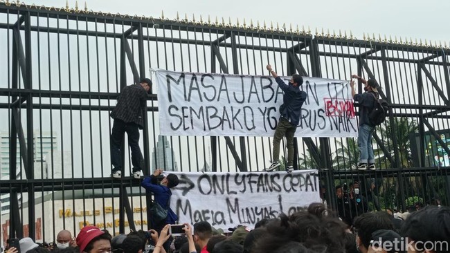 Pantauan detikcom di gedung DPR RI, Jakarta Pusat, Senin (11/4/2022), massa aksi mulai merapat ke pintu utama gedung DPR RI. Perwakilan dari mereka memanjat pagar hitam yang ada di DPR.