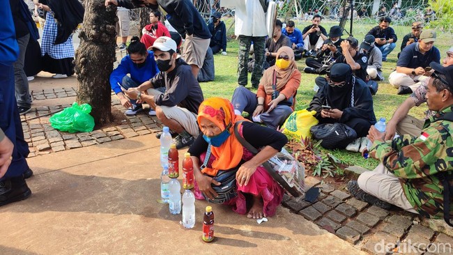 Pantauan detikcom di lokasi, Senin (11/4/2022) pukul 15.40 WIB, terlihat sejumlah pedagang menawarkan minuman kepada massa aksi. Mereka menjual mulai dari air mineral, es teh manis, kopi, hingga minuman perasa lainnya.