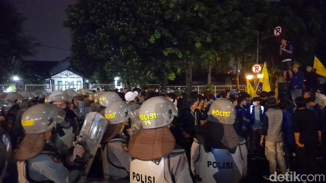 Mahasiswa yang berhasil menerobos pagar kawat berduri kini saling berhadapan dengan polisi di Jalan Sudirman, Kota Bogor. Mahasiswa masih terus melakukan orasi dan nyanyian pergerakan.