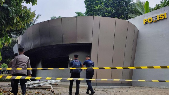 Tim Pusat Laboratorium Forensik (Puslabfor) Polri melakukan olah tempat kejadian perkara (TKP) di pos polisi (pospol) Pejompongan, Jakarta Pusat (Jakpus). Pospol Pejompongan itu dibakar orang tak dikenal (OTK) setelah massa demo 11 April di DPR bubar.