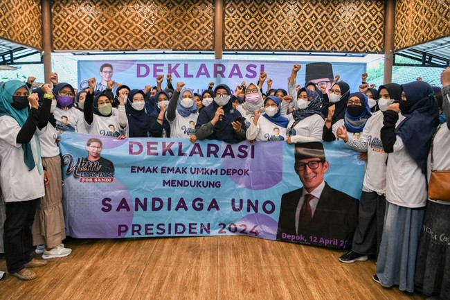 Dukungan terhadap Menteri Pariwisata dan Ekonomi Kreatif (Menparekraf) Sandiaga Uno untuk maju dalam pilpres 2024 kembali muncul. Kali ini dilakukan oleh emak-emak UMKM For Sandi di Rumah Makan Gubuk Gurame, Depok, Jawa Barat.