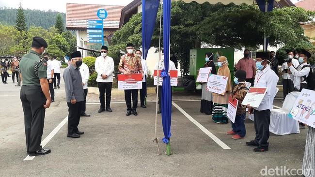 Penyerahan bantuan secara simbolis berlangsung di Lapangan Setda Kabupaten Aceh Tengah, Rabu (13/4/2022). Ma'ruf Amin didampingi Gubernur Aceh Nova Iriansyah dan Bupati Aceh Tengah Shabela Abubakar.