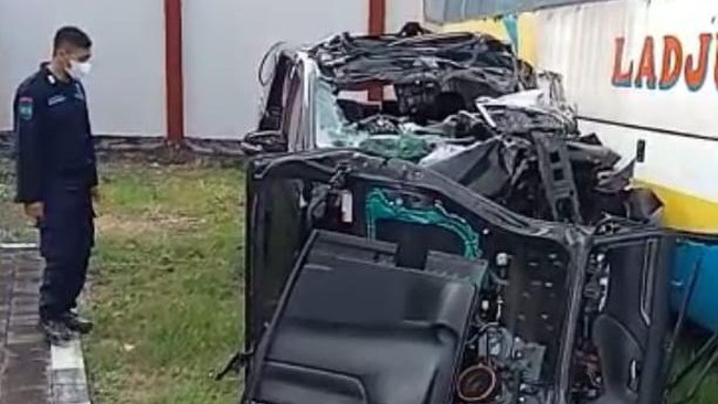 Bagian depan mobil hingga kaca depannya hancur. Kerusakan juga terjadi di atap (moon roof dan sun roof) mobil dari depan hingga mengarah ke sisi tengah dan kiri.