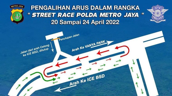 "Satlantas Polres Tangerang Selatan Akan Melaksanakan Pengalihan Arus Lalu Lintas Dalam Rangka Street Race Polda Metro Jaya. Pengalihan Arus Lalu Lintas Dilaksanakan Mulai 20 April 2022 s/d 24 April 2022," seperti ditulis akun @satlantaspolrestangsel, Selasa (19/4/2022).