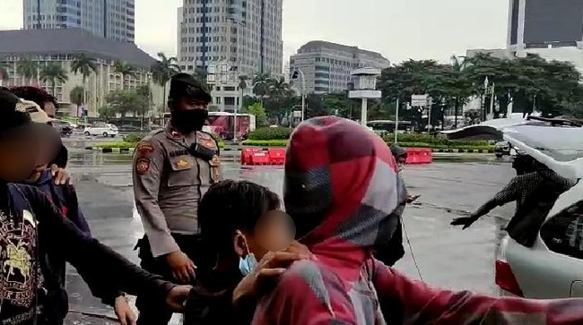Polisi mencegat tujuh orang pelajar di kawasan Patung Kuda, Jakarta Pusat. Ketujuh pelajar ini mengaku hendak ikut demo 21 April 2022.