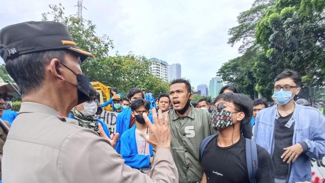 Anggota kepolisian terlibat adu mulut dengan mahasiswa yang akan menggelar demo di depan Gedung DPR RI. Massa memprotes pemeriksaan petugas kepolisian di titik penyekatan Jl Gatot Subroto, Jakarta Pusat.
