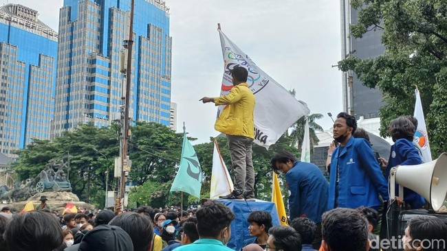 Massa aksi yang tergabung dalam Aliansi Mahasiswa Indonesia (AMI) menggelar demo di Patung Kuda, Jakarta Pusat. Mereka membawa sejumlah tuntutan, mulai tolak perpanjangan masa jabatan presiden 3 periode hingga masalah perekonomian.