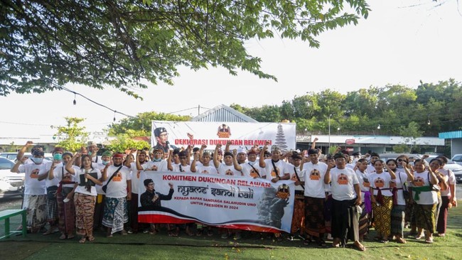 Ratusan relawan yang tergabung dalam Nyame Sandi Bali mendukung Sandiaga Uno maju di Pemilihan Presiden 2024. Relawan ini merupakan gabungan dari pelaku transportasi wisata hingga milenial di kawasan Bali Cliff, Ungasan, Kabupaten Badung, Bali.