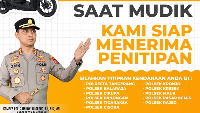 Kapolresta Tangerang Zain Dwi Nugroho mengatakan pihaknya siap menerima kendaraan yang akan ditinggalkan mudik oleh pemiliknya pada Lebaran 2022 kali ini. Menurutnya, ini dilakukan untuk memfasilitasi jika ada pemudik yang khawatir meninggalkan kendaraannya dengan kondisi rumah kosong.