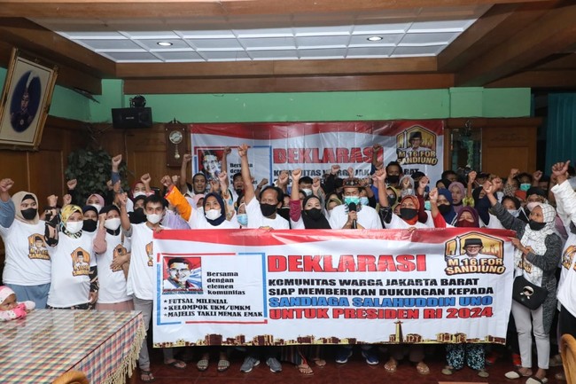 "Kita mendeklarasikan bapak Sandi yang didukung dari masyarakat terutama milenial dan emak-emak. Pak Sandi itu memiliki track record yang jelas. Beliau salah satu tokoh di Republik (Indonesia) ini, dan juga satu pengusaha yang sudah mapan dan memiliki strategi ekonomi yang sangat baik," kata Ketua Deklarasi Relawan M16 For Sandiagauno, Suherlan dalam keterangan tertulis, Senin (25/4/2022).