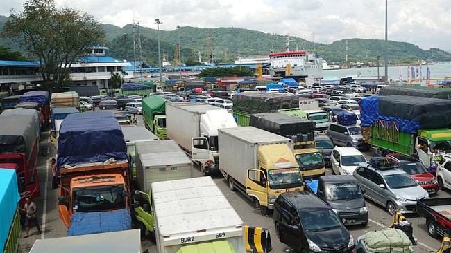 Pelabuhan Merak hingga siang ini masih dipadati oleh kendaraan pemudik yang hendak menyeberang ke Pelabuhan Bakauheni, Lampung. Antrean kendaraan terjadi di area kantong parkir dermaga 1 hingga dermaga 5.