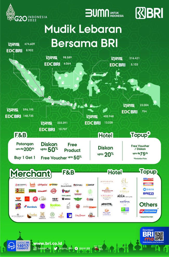 Untuk transaksi di lebih dari 2.000 resto & cafe menggunakan EDC dan QRIS BRI, ada diskon sampai dengan 50% atau Rp 200.000 di merchant unggulan BRI.
