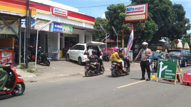 Polisi mengalihkan arus lalu lintas di jalur arteri Rangkabitung-Pandeglang, Banten. Pengalihan arus lalu lintas dilakukan demi mencegah kemacetan di hari kedua Lebaran.