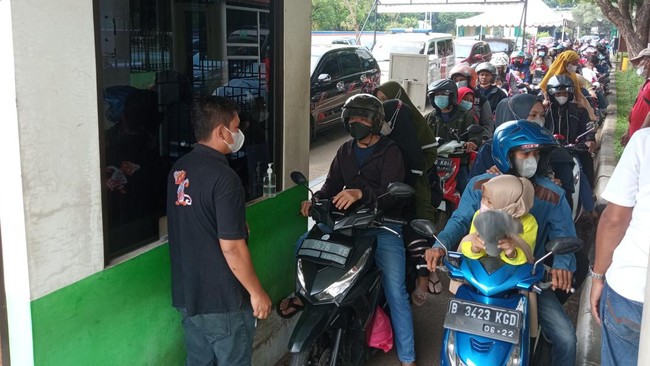 Pengunjung yang dipadati kendaraan roda dua membuat pengelola memperpanjang antrean hingga ke dalam kawasan TMII. Pengelola sempat kesulitan mengatur antrean motor.