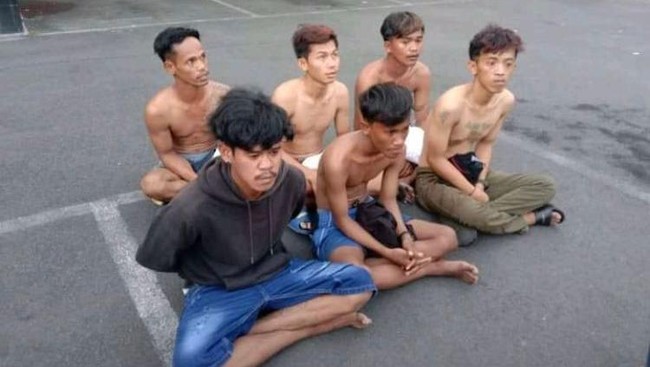 Dilansir detikSulsel, Rabu (4/5/2022) dari foto yang diterima, enam terduga pelaku duduk di halaman Mapolrestabes Makassar. Lima dari enam orang terduga pelaku tampak telanjang dada.