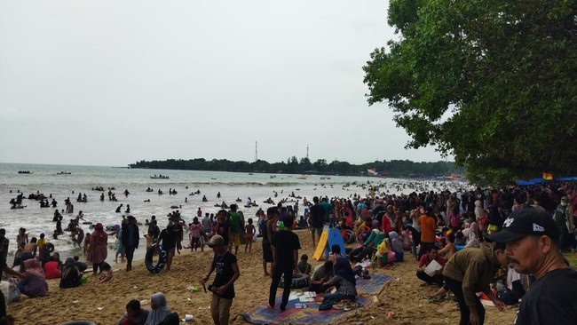 Kawasan Pantai Carita di Pandeglang, Banten, diserbu wisatawan pada H+2 Lebaran 2022. Area pantai dipenuhi warga yang bermain air ataupun duduk-duduk di pasir.