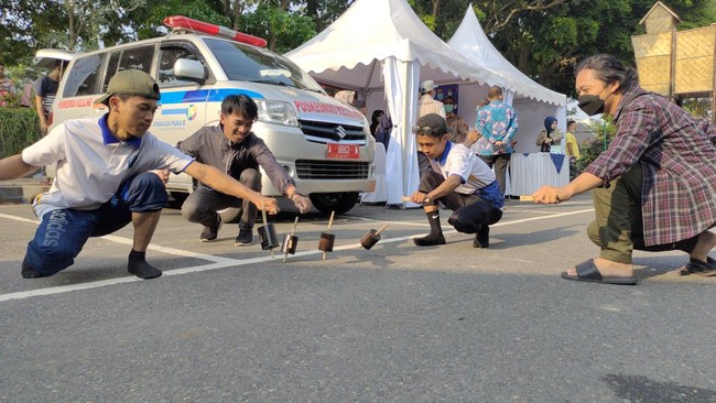 Permainan tradisional disediakan di depan Gedung Bupati Lebak, Rangkasbitung. Berdasarkan pantauan detikcom di lokasi, Kamis (5/5/2022), banyak warga yang antusias memainkan permainan tradisional. Tidak hanya anak-anak, orang dewasa pun ikut memainkan permainan ini.