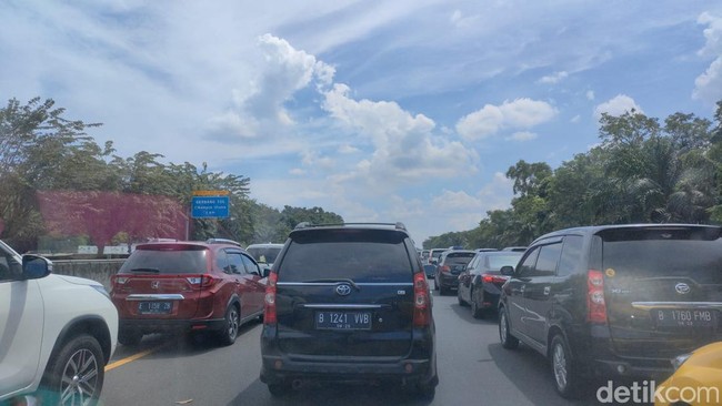 Lalu lintas arus balik menuju Jakarta siang ini padat merayap menjelang Gerbang Tol Cikampek Utama. Begini kondisinya.