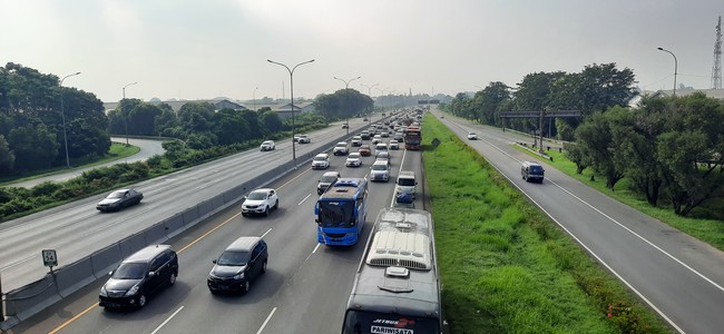 Pantauan detikcom di Km 54 Tol Jakarta-Cikampek, Sabtu (7/5/2022), pukul 08.50 WIB, ada perbedaan kondisi lalu lintas di ruas kanan dan kiri.
