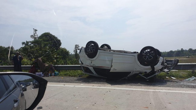 Kecelakaan mobil terjadi di Km 79+600 Tol Cipali. Kecelakaan itu membuat sebuah mobil terbalik di tengah jalan.