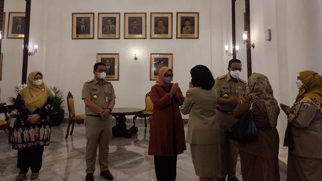 Saat bersalaman dengan Anies dan Riza, para pegawai Pemprov juga terlihat berfoto bersama. Pegawai Pemprov lainnya nampak juga bersalaman antarsesama.
