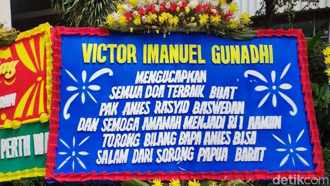 Salah satunya karangan bunga yang dikirim dari Victor Imanuel Gunadhi, yang mendoakan Anies menjadi RI-1. Karangan bunga lainnya terlihat dari Kepala Suku IMEKIO Ibrahim Wugaje, yang mendoakan Anies menjadi presiden tahun 2024.