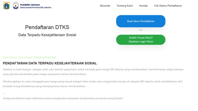 Melansir laman resmi DTKS Kemensos RI, Data Terpadu Kesejahteraan Sosial Jakarta merupakan data yang dijadikan acuan pemberian bantuan sosial dari Kementerian Sosial RI (Kemensos RI) kepada warga miskin atau warga tidak mampu di wilayah DKI Jakarta.