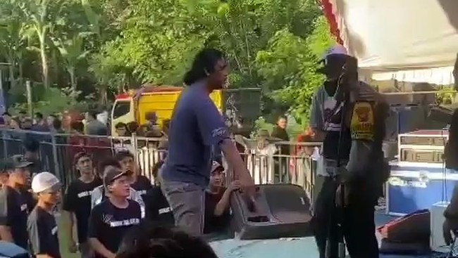 Dalam video yang beredar, tampak seorang pria berada di atas panggung. Diduga pria itu sedang mabuk dan menantang petugas polisi. Terlihat pria itu tampak mendorong-dorong polisi yang ada di depannya. Warga lain tampak berupaya memisahkan pria mabuk itu dengan polisi.