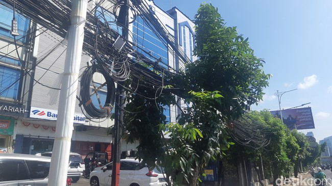 Terpantau di Jl Mampang Prapatan Raya, Jakarta Selatan, Jumat (13/5/2022) pukul 10.00 WIB, kabel-kabel di atas tiang sepanjang jalan masih nampak semrawut.