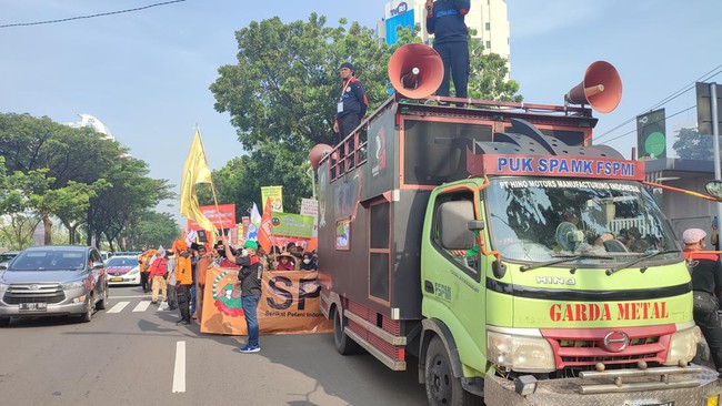 "Selamat hari buruh sedunia yang jatuh pada 1 Mei 2022. Ayo berkumpul di belakang mobil komando," kata pria di atas mobil komando tersebut.