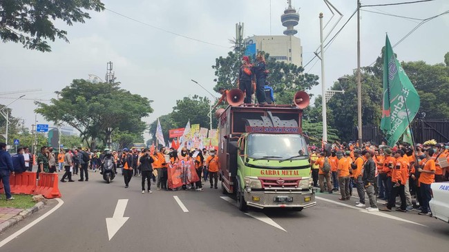 Pantauan detikcom di depan Pintu 10 Gelora Bung Karno (GBK), Sabtu (14/5/2022), pukul 10.05 WIB, massa mulai melakukan long march. Lalu lintas menuju arah DPR ditutup sementara selama long march bergulir.