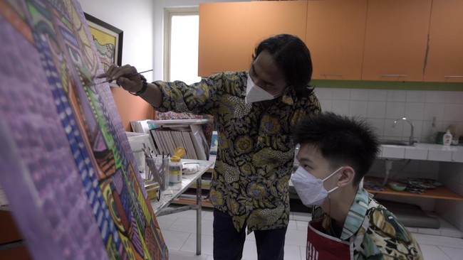 "Jadi kalau murid-murid saya, saya akan mencari tahu dengan test. Lalu saya kasih media, saya lihat dia bagusnya di bagian apa. Di garis kah, di permainan warna, di ekspresi. Nah dari keahlian itu saya kasih pekerjaan mereka untuk membuat karya seni. Sambil saya lihat di mana dia paling terasa sangat ringan, sangat bahagia, dan happy bisa menyelesaikannya dengan sangat bagus," jelas Kak Toto.