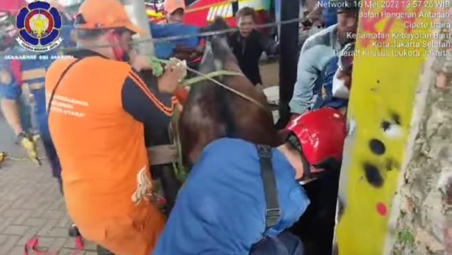 Evakuasi sendiri memakan waktu sekitar 30 menit dimulai pukul 13.33 WIB dan berakhir pada pukul 14.05 WIB. Dilihat melalui rekaman video di Instagram @humasjakfire, beberapa petugas damkar mengangkat kuda yang terperosok sambil dibantu warga dan alat derek.