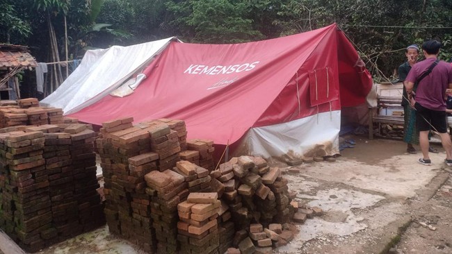 Sudirman (60), warga Kampung Sabrang, Desa Cibitung, Kecamatan Munjul Pandeglang, harus tinggal di tenda yang bertulisan 'Kemensos RI' bersama istri dan anaknya yang masih duduk di bangku SMP dan SMA.