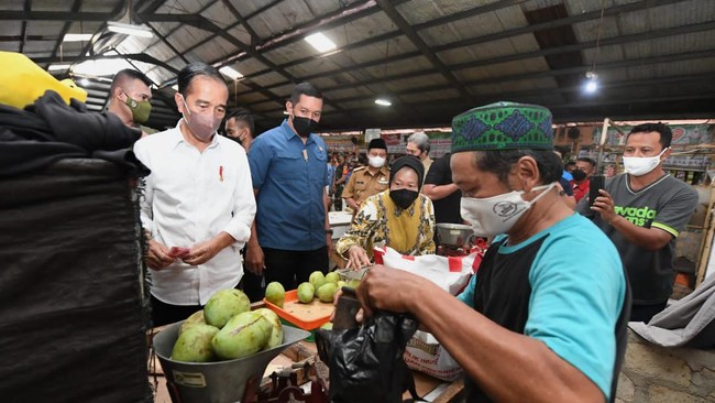 Presiden Joko Widodo (Jokowi) blusukan ke Pasar Cibinong, Kabupaten Bogor, dan Pasar Gunung Batu, Kota Bogor. Jokowi membagikan sejumlah bantuan sosial (bansos) bagi masyarakat penerima manfaat dan pedagang.
