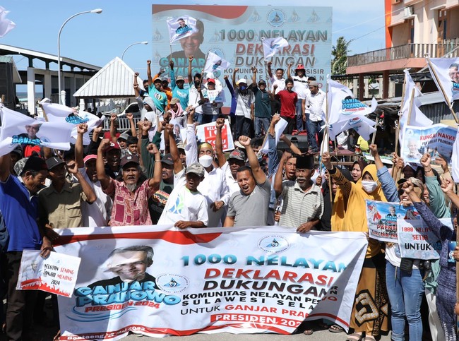Ribuan nelayan yang tergabung dalam Komunitas Nelayan Pesisir Sulawesi Selatan mendeklarasikan dukungan terhadap Ganjar Pranowo untuk menjadi presiden RI di 2024. Mereka berharap jika menjadi presiden Ganjar dapat membuat kehidupan nelayan pesisir lebih baik.