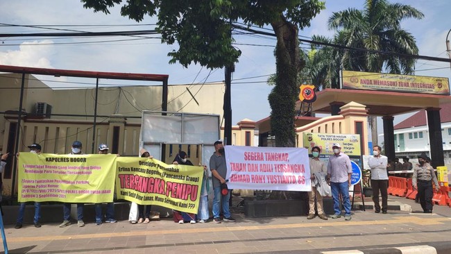 Sejumlah korban dugaan penipuan pengembang perumahan di Cibinong mendatangi Polres Bogor. Mereka menggelar aksi di depan Polres Bogor dengan tuntutan meminta agar pelaku segera ditangkap.