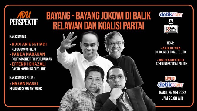 Malam ini Adu Perspektif menghadirkan eksklusif Ketua Projo Budi Arie Setiadi bersama politikus senior PDI Perjuangan Panda Nababan dan pakar komunikasi politik UI Effendi Gazali, serta Direktur Cyrus Network Hasan Nasbi dengan topik 'Bayang-Bayang Jokowi di Balik Relawan dan Koalisi Partai'.