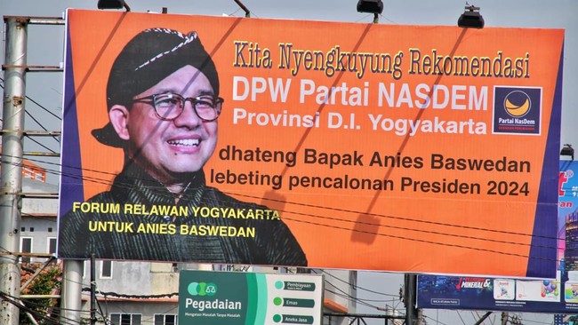 Sejumlah baliho bergambar Anies Baswedan dengan narasi dukungan Capres 2024 muncul di jalanan DI Yogyakarta. Pada baliho itu, terdapat logo partai NasDem.