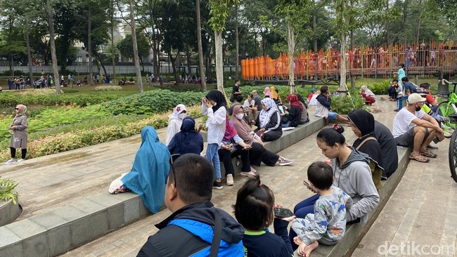 Pantauan detikcom di lokasi, keramaian terlihat sejak pukul 07.00 WIB. Para pengunjung duduk di bangku maupun pinggiran taman.